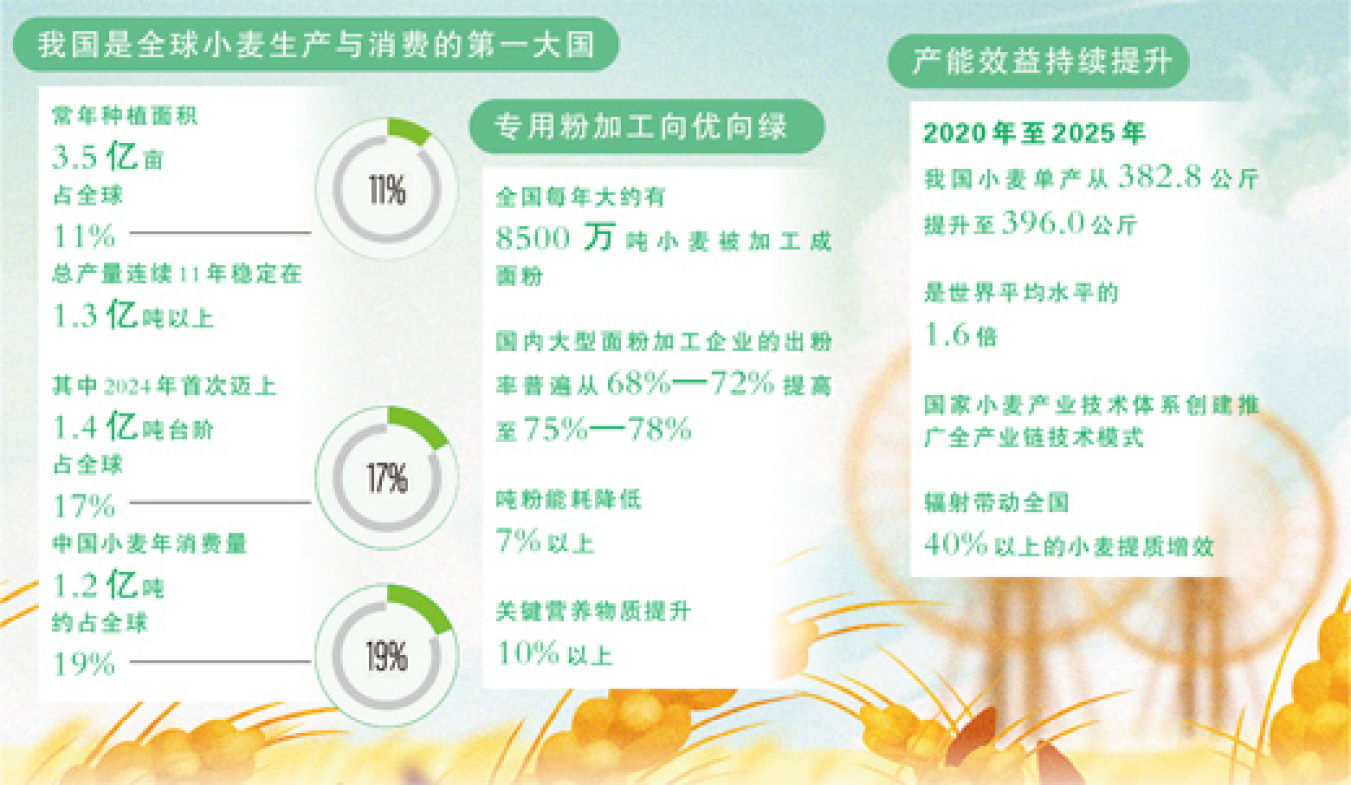 品种改良、绿色高效栽培技术创新与集成、智能测报与绿色防控……过去5年里,国家小麦产业技术体系通过集成综合技术促单产,推动我国小麦单产从2020年的382.8公斤提升至2025年的396.0公斤,有力保障着供需平衡。“这个数字目前是世界平均水平的1.6倍。”刘录祥说。