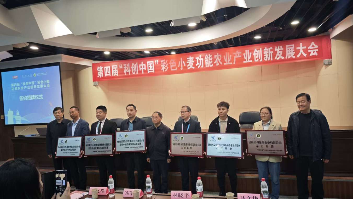 何一哲研究员代表“科创中国”彩色小麦功能农业产业服务团,与江苏丰济仓生态农业发展有限公司、河南彩粒方农业科技有限公司、杨凌腾玥云仓供应链管理有限公司、安徽亳州谯夷农业科技有限公司、安徽宿州金海面业有限公司、陕西渭南富平县谷昌农业科技有限公司、陕西西安临潼区交口街道办事处高铁村等7个彩色小麦功能农业产业示范基地签约,省科学技术协会二级巡视员曹文举、省农学会会长樊民周研究员为示范基地授牌。