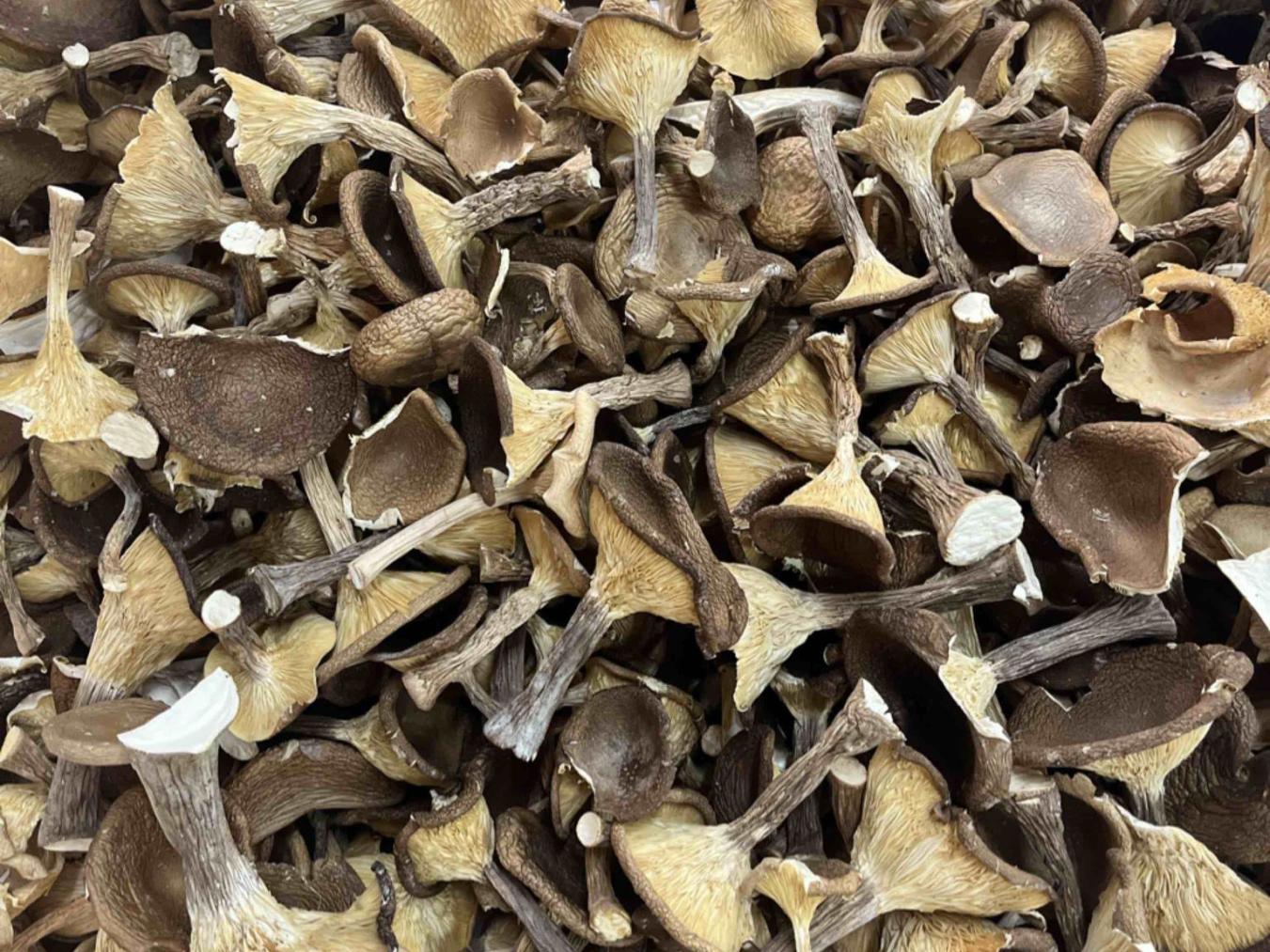 子实体呈漏斗状、边缘内卷、孢子未弹射时采收,用剪刀在土面菇柄处剪下。采收时保护未成熟子实体,取出残留菇柄,避免腐烂招致病虫害。上市销售的猪肚菇,采收后剪去多余菌柄,按菌盖大小分级包装。未及时上市的产品,置于0—3°C冷库中可保鲜10~15天。