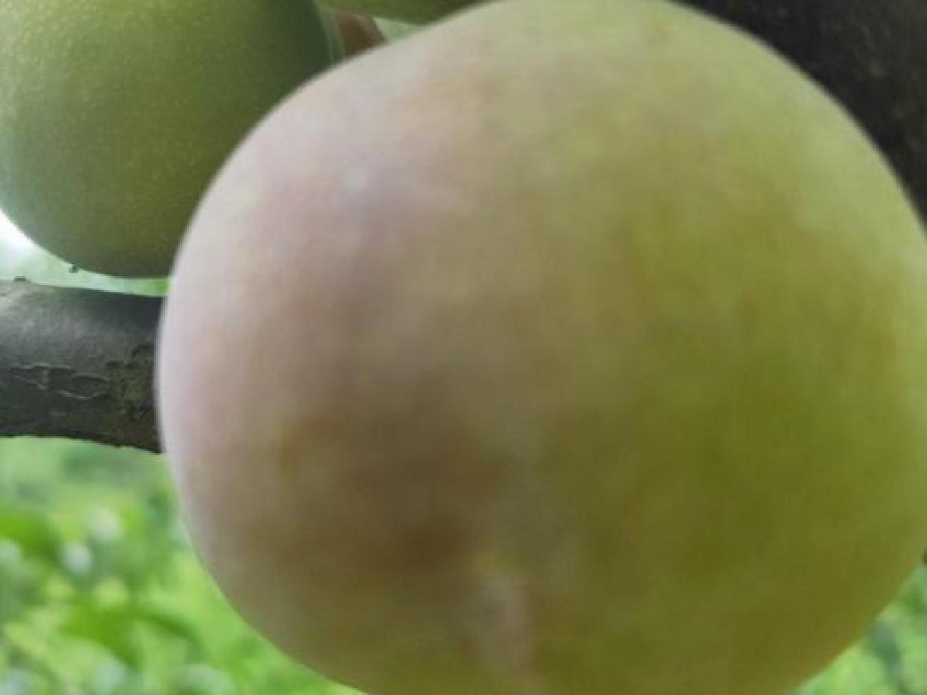 每年7月,茵红李的果实成熟,它们近圆球形,平均单果重33.3克,成熟时果皮底色青黄,阳面紫红,全果着粉,缝合线明显,果梗长达3厘米。轻轻剥开果皮,露出黄绿色的果肉,离核,质地嫩脆,甜而不腻,清香爽口,是夏日解暑的佳品。
