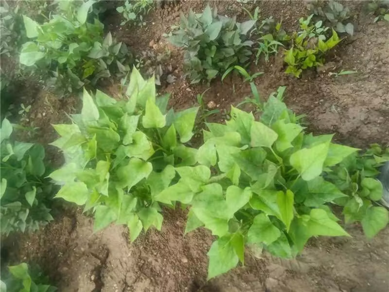 25号烟薯苗通常呈现出浓绿色的叶片,叶形为掌状分裂,叶脉清晰可见,整体植株较为紧凑,茎蔓短而粗壮。幼苗期的烟薯苗颜色偏嫩绿,随着生长期推进逐渐变为深绿色,根系发达,具有较强的抗逆性和适应能力。