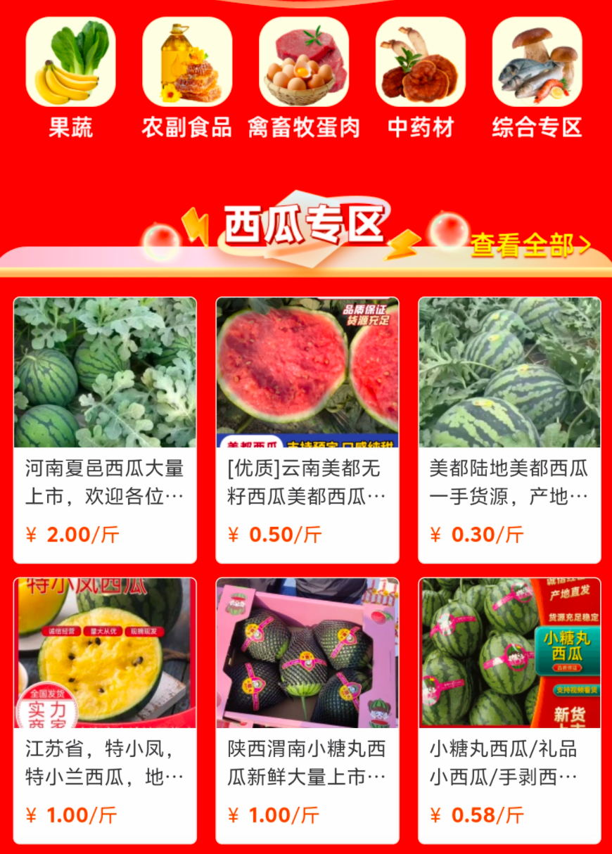 目前各地西瓜正值大量出货期,一亩田平台特别设置了“春季拿货节会场”西瓜板块,汇集了全国各大西瓜主产区优质货源,帮助采购商了解行情、快速对接。