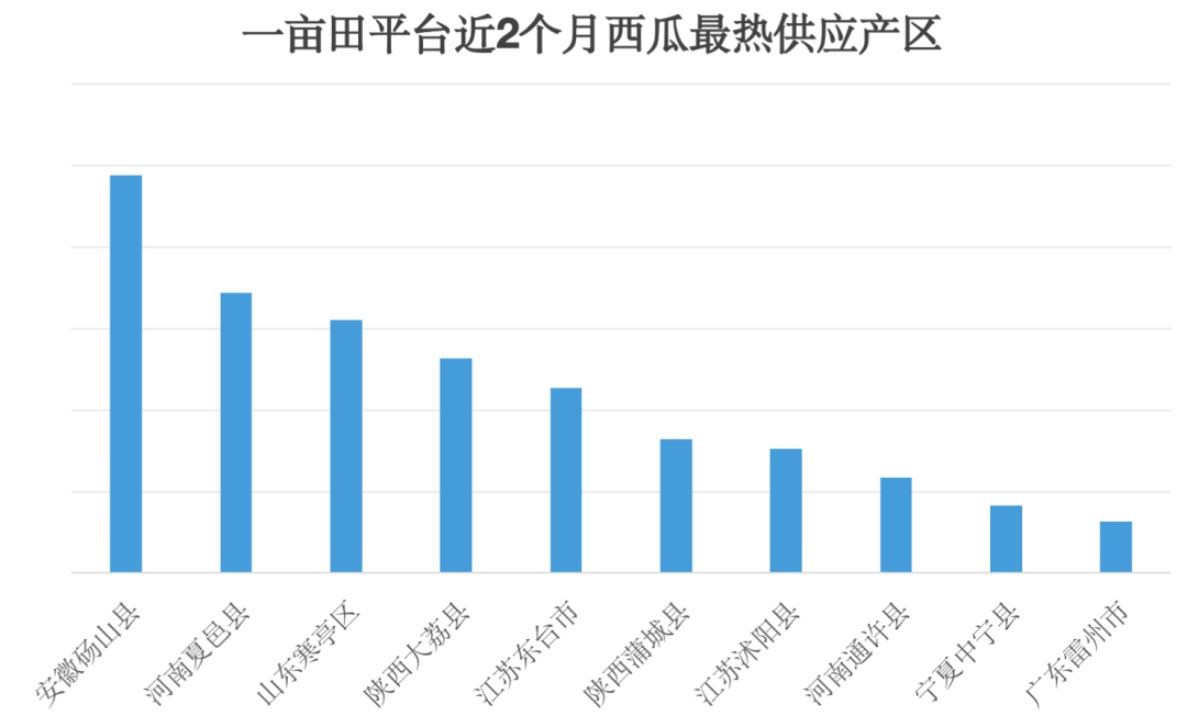 从3月开始,夏季最大的水果单品西瓜,就开始逐渐在全国范围内上市,一亩田平台数据显示,近2个月全国西瓜主要的供应产区广泛分布在安徽、河南、山东、陕西、江苏等多地,伴随着产量的上升,各地西瓜的价格也在不断下降。