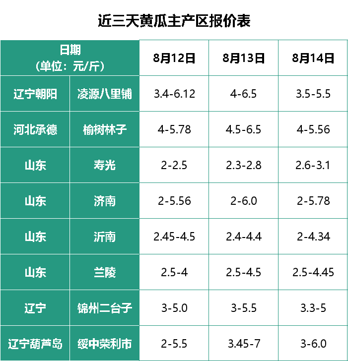 8月14日,黄瓜产区价格以平稳为主,精品好货价格略有下降。山东济南曲堤市场大花黄瓜价格每斤5.8元,鲜花黄瓜每斤3.8-5.5元,价格滑落;辽宁朝阳产区每斤3.5-5.5元,跌0.5-1元;河北承德产区每斤4-5.56元,跌0.5-1元;山东寿光市场每斤涨0.3元;其他产区价格平稳。
