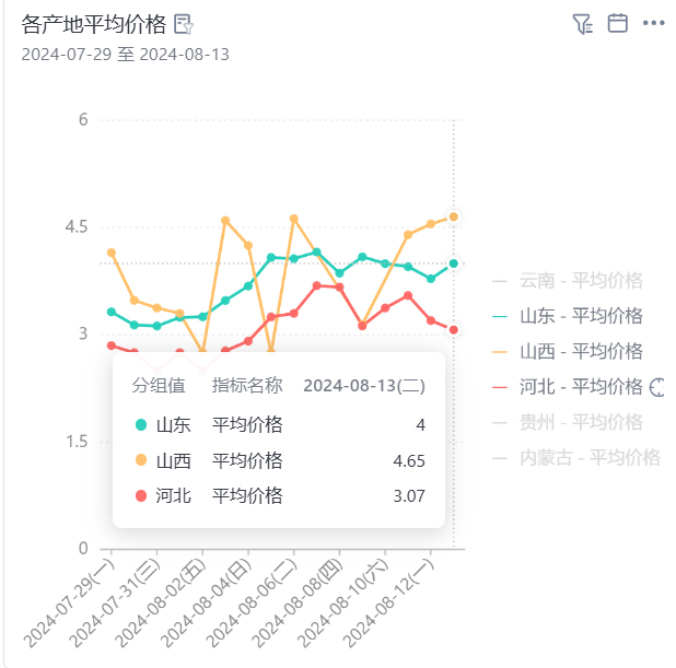 8月13日,批发市场中,各产地黄瓜均价涨跌不一,山东和山西产区黄瓜价格上涨,河北产区价格下跌。