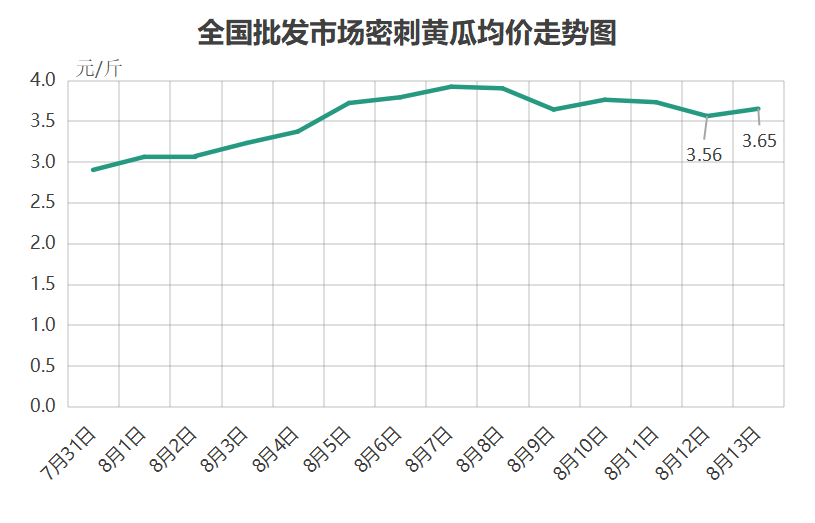8月13日,全国密刺黄瓜批发价格在连续几天下跌后,出现小幅上涨,批发均价为每斤3.65元,环比昨天单日涨幅为2.5%。