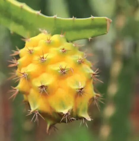 黄皮火龙果按果实表面有无刺而分为两类。无刺的品种通常被称为黄龙火龙果,原产地为以色列;另一种黄皮火龙果果实表面带刺,由于外皮带有酷似神话中龙的鳞片,被称作麒麟果,又被称为燕窝果。
