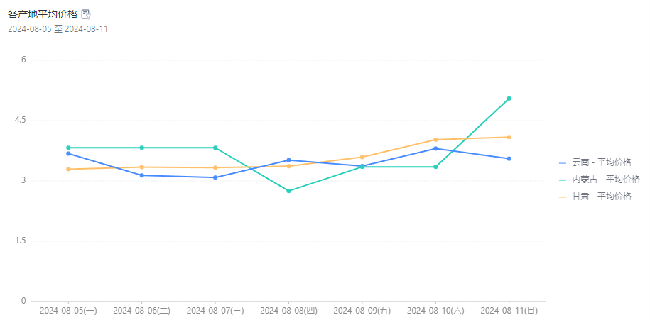 从产地看,内蒙古地区遇到强降雨天气,阻碍菠菜采摘,京津冀地区强降雨也阻碍了内蒙古菠菜南下的交通运输,导致内蒙古地区价格上涨明显,截止11日,批发市场上,内蒙古菠菜价格达到5元/斤。内蒙古菠菜供给量减少后,市场依赖甘肃、云南菠菜,导致甘肃和云南菠菜价格上涨,天气转晴后,云南菠菜价格出现下跌。截止11日,甘肃菠菜价格为4.05元/斤,云南菠菜价格为3.55元/斤。