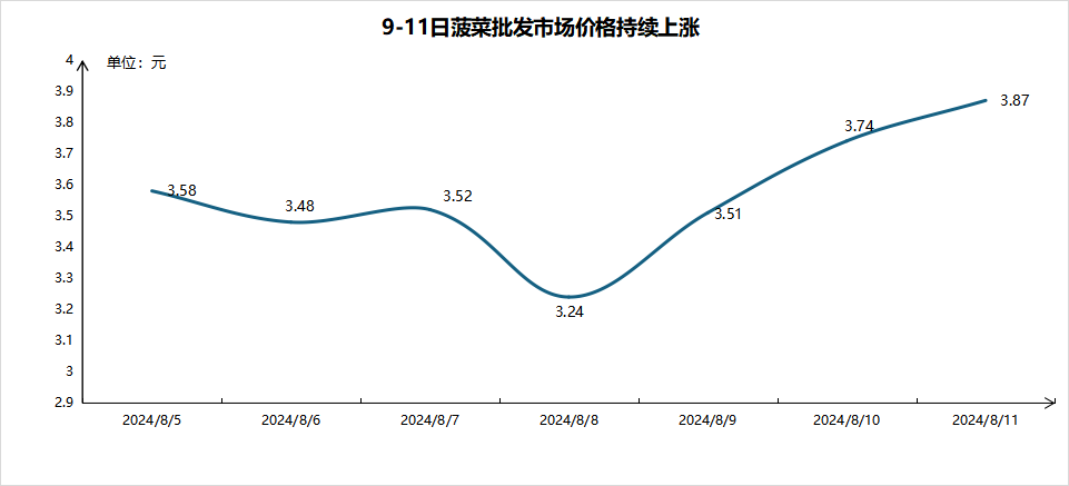 受降雨天气影响,9-11日菠菜价格持续上涨,截止11日,全国菠菜批发市场平均价格为3.87元/斤,较9日上涨0.36元。