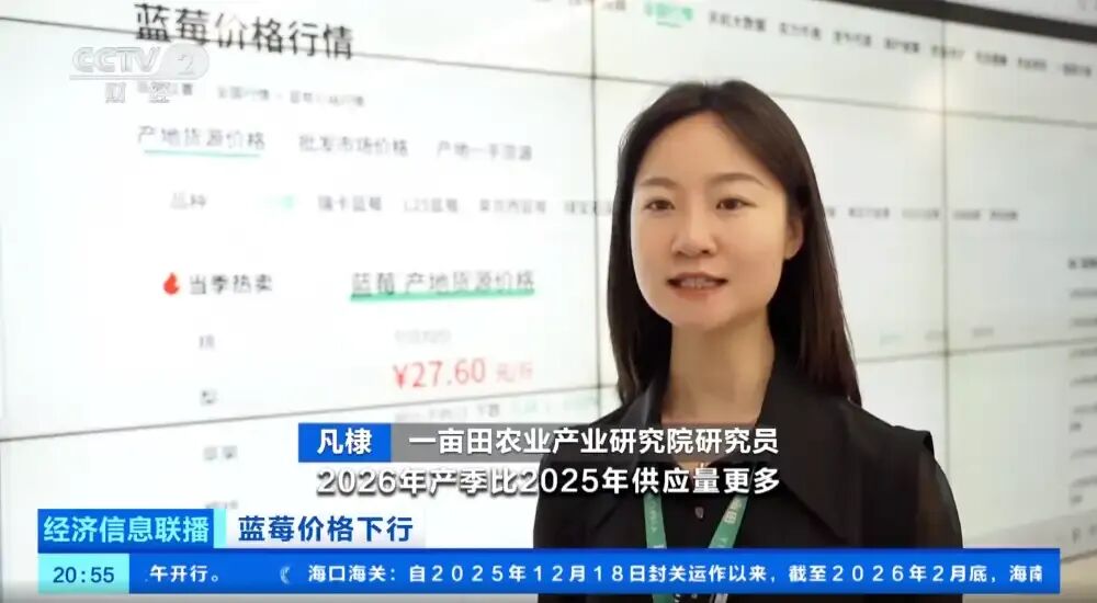 央视关注!蓝莓大掉价,同比下跌50%,一亩田解读:预计行情持续低位运行