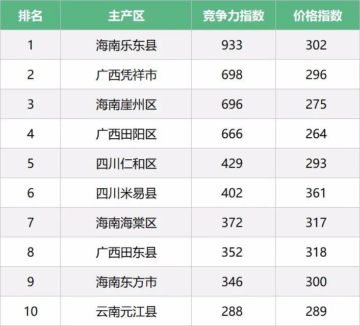 从一亩田芒果产地竞争力排行榜中也可以看出,产量排在第一的云南省,仅元江县进入榜单,并仅排在第十位,价格指数也在榜单中属于中低档,而海南省芒果价格指数则相对较高。