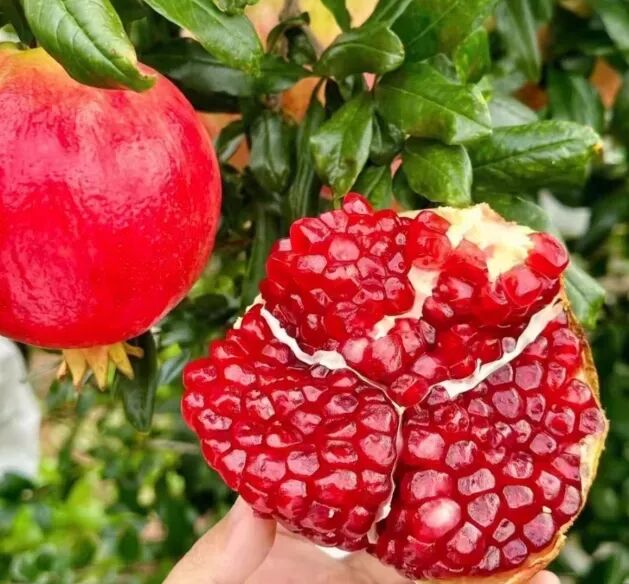 突尼斯软籽石榴是近年来市场上最受欢迎的石榴品种之一。与传统硬籽石榴不同,它的籽粒柔软可食,口感清甜多汁,大大提升了食用体验。该品种是1986年从突尼斯引入我国的,经过多年的栽培试验,最终在四川会理、云南蒙自和河南荥阳等地成功种植并推广,现在陕西、山东、河南等省份也开始逐步引种。