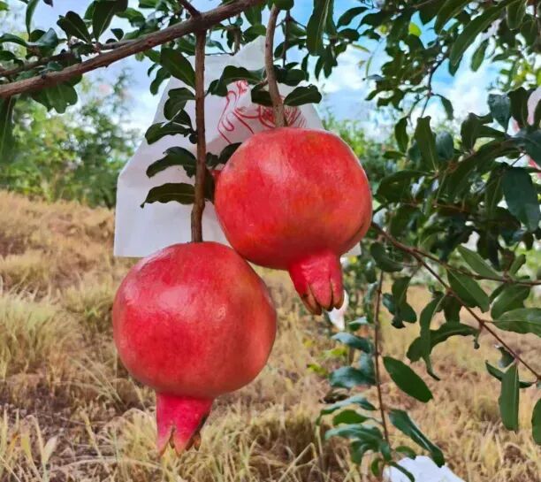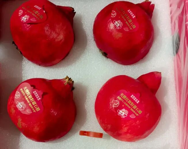 另外还有超软籽的天使红石榴,以“中石榴1号”为母本,“黒籽甜”为父本杂交选育而成,果实呈圆形,个头偏大,表皮全红,含糖量在18.7%,比突尼斯软籽石榴提前20天成熟,主要走高端市场。