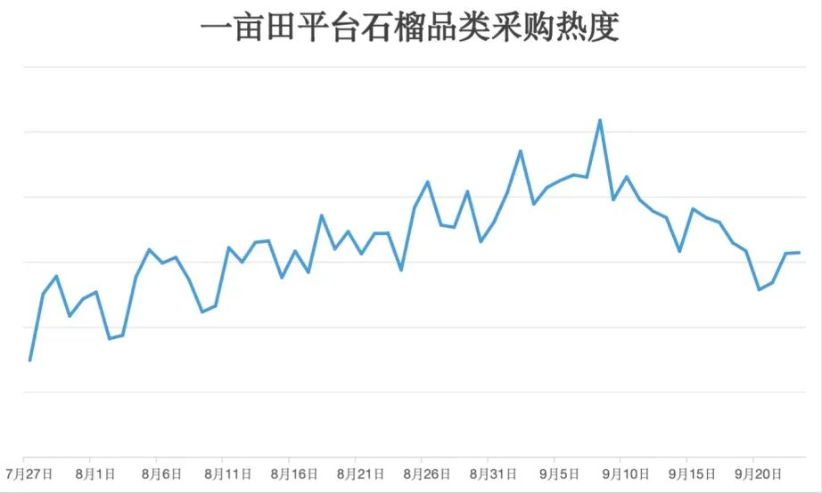 根据一亩田平台石榴品类采购热度走势可以看出,从9月起市场需求开始下降,而近一周,由于临近中秋国庆,采购热度再次出现短期回升。在这种情况下,石榴的产地价格也随之变化。
