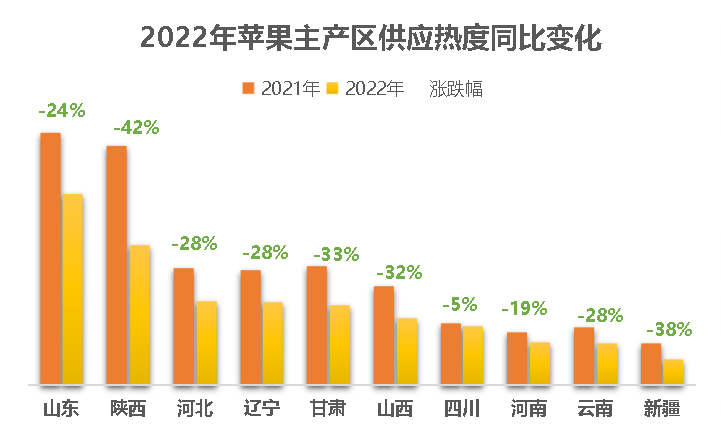 进入2022年,苹果价格一改往年颓势,呈现逐步走高趋势,今年,一亩田平台大数据显示苹果批发价格同比上涨超四成,主要原因在于今年全国主产区苹果产量出现了不同程度的下滑,相应的,一亩田平台中苹果供应热度也有所下降,个别地区降幅达40%。