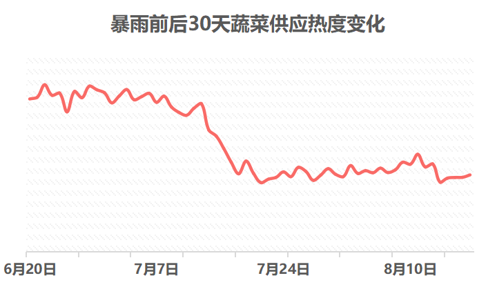 这一轮全国普降的暴雨天气对蔬菜生产造成了不可逆转的损失,根据一亩田平台中蔬菜供应热度变化情况,从7月13日-7月20日,蔬菜供应热度快速下滑,与暴雨之前相比下跌了19%,并且近期仍无好转迹象。