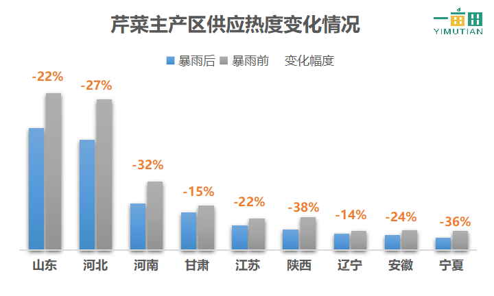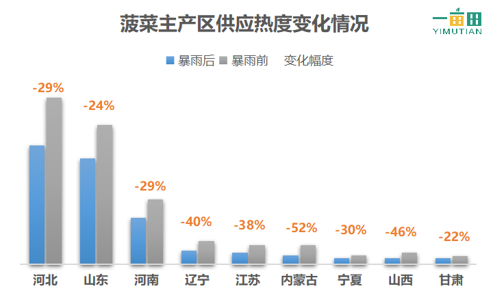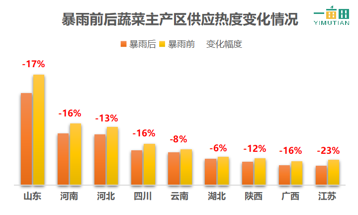 从暴雨对蔬菜产区的影响来看,不仅仅是河南地区受到天气影响,其他蔬菜主产区,如山东、河北、四川及云南等地也都受到了不同程度的影响。其中,蔬菜生产第一大省份山东省,在暴雨天气发生后,蔬菜供应热度下降了17%,河南省和四川省下降了16%,河北省下降13%。