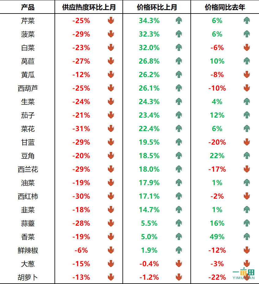 主要蔬菜供应热度和价格对比变化趋势