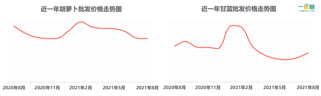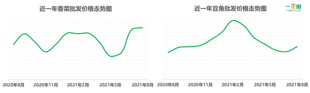 在以往年份中,每年七月和八月期间,在面临高温、暴雨等不利天气情况下,蔬菜价格往往会出现不同程度的上涨,2020年同期蔬菜生产和运输还受到局部疫情散发的影响,价格也是居高不下。今年全国普降的这场暴雨,同样也推动了蔬菜价格快速上涨,20种蔬菜中价格涨跌互现,同比去年价格上涨最高的蔬菜是香菜,同比上涨49%,其次为豆角,同比上涨22%;同比去年价格下跌最高的蔬菜是胡萝卜,同比下跌22%,其次为甘蓝和西兰花,同比分别下跌20%和17%。