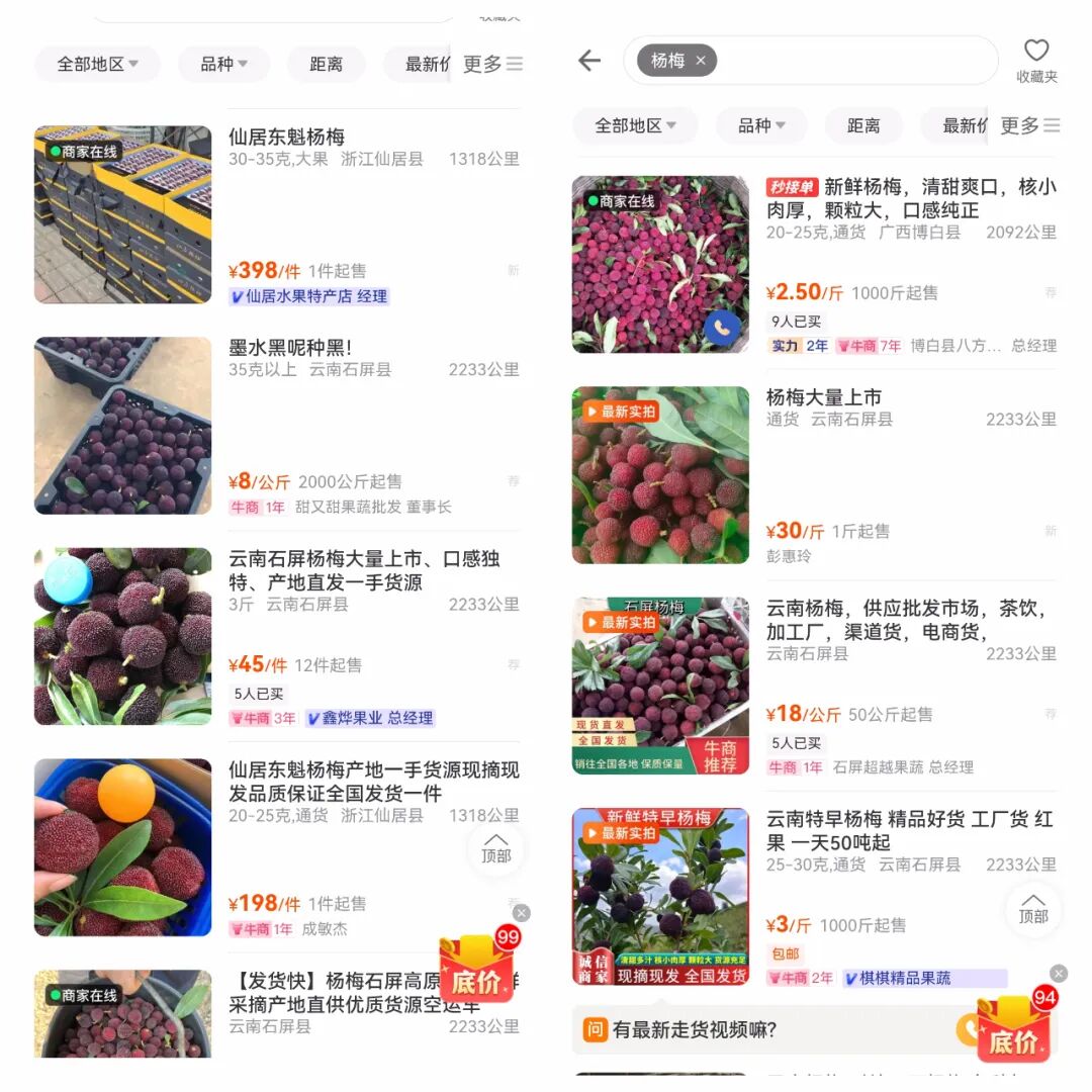 不少商家已经开始少量进购杨梅,吸引消费者的目光。接下来,天气渐暖,相信市场对杨梅的需求量也会越来越大。目前,一亩田平台来自云南、广西、福建等地不少商家已经开始供应杨梅,欢迎各电商主播、社区团购、精品商超、连锁水果店等商家来一亩田平台采购货源。