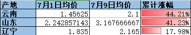 受降雨天气及云南黄瓜下市影响,云南和山东产区黄瓜涨幅均超40%,截止7月9日,云南黄瓜均价突破2元,较7月1日上涨44.21%;山东黄瓜均价突破3元,较7月1日上涨41.23%。辽宁产区价格多为跟涨,涨幅为17.98%。随着北方高温天气持续,南方产区品质和产量受损,优质黄瓜需求持续存在,7月下旬起辽宁黄瓜将快速上涨。