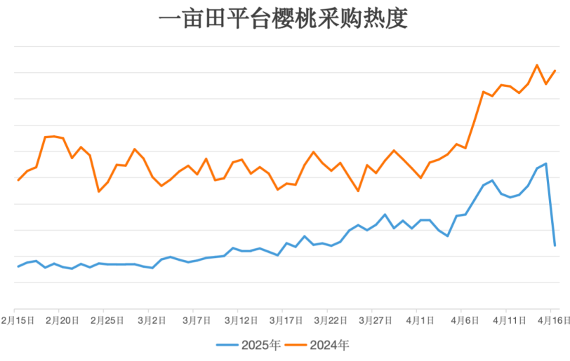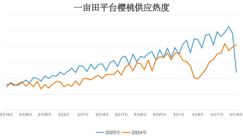 从一亩田平台大数据来看,从2月中旬至今,樱桃的供应热度比去年整体要高,且上升速度快,这意味着樱桃的产量同比有所增加,并且各产区上市时间更加集中。