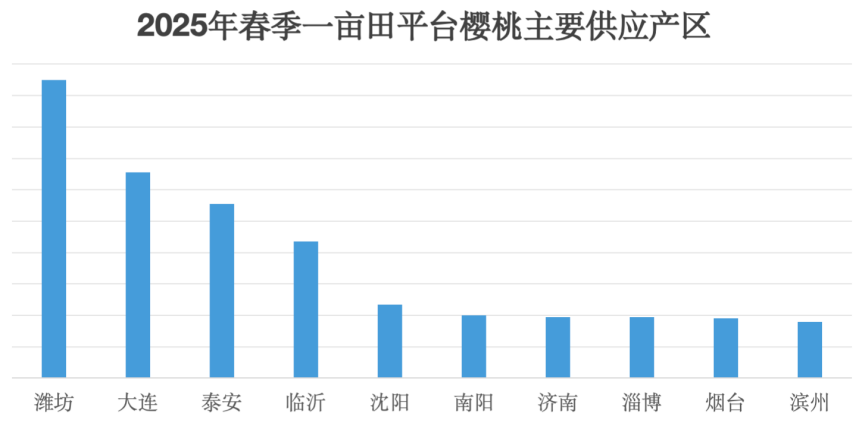 樱桃适应性强,全国都可以种植,再加上暖棚技术的发展,延长了国产樱桃的供应期。在一亩田平台,目前国产大樱桃的产区主要还是集中在山东、辽宁、陕西等地,此外四川成都等地也有少量上市,主要是小樱桃品种。