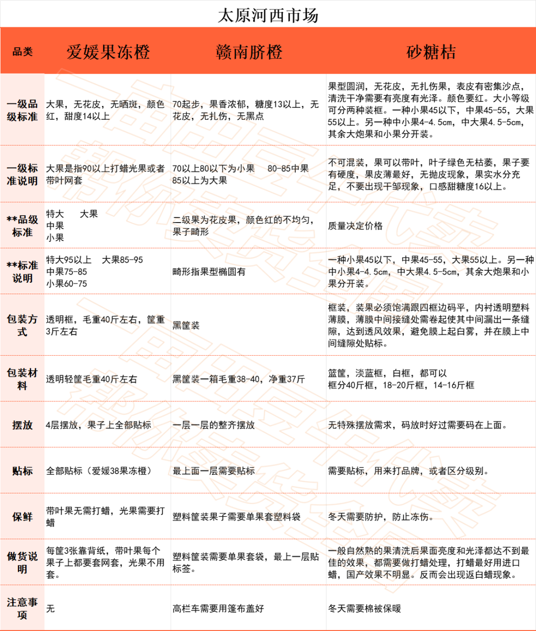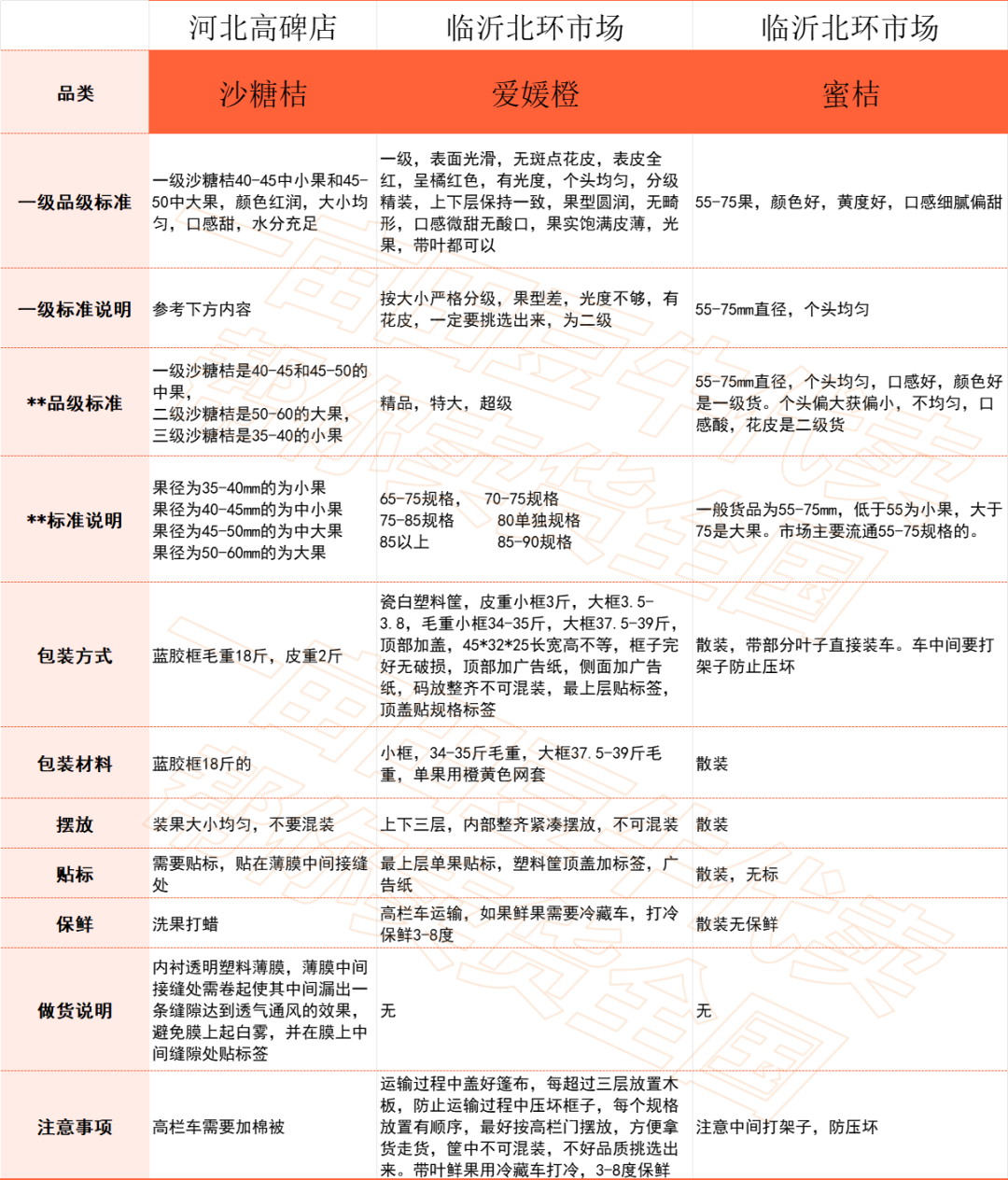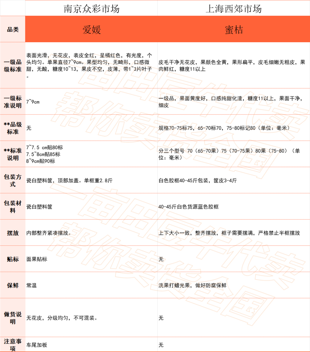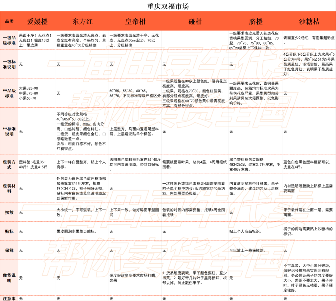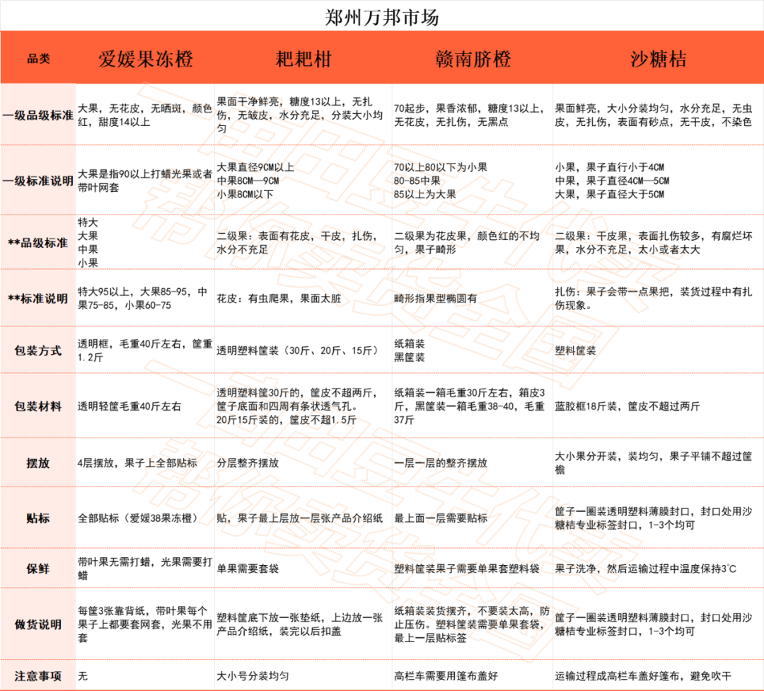 基于平台积累的深厚资源,我们还整理出全国10个批发市场柑橘类做货标准,帮助百万货主更加轻松对接全国批发市场渠道,让大家卖货更省心。注意:等级分类、做货标准与品类、市场、季节等均有一定关系,以下内容仅供参考。