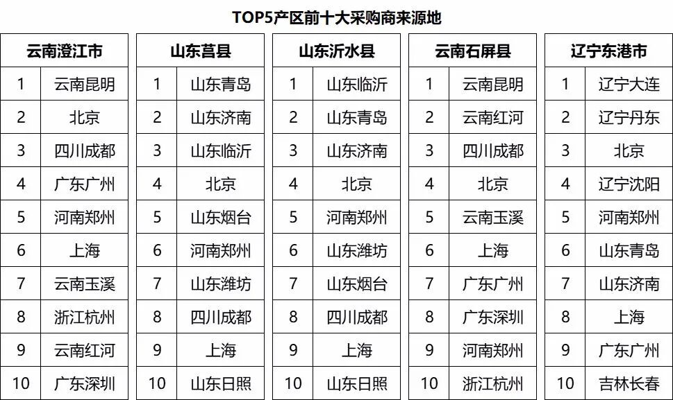 注:对2023年一亩田平台中蓝莓产地竞争力排名前五的地区进行采购商来源分析,可以反映出蓝莓不同主产区的采购商来源地区的差异情况。