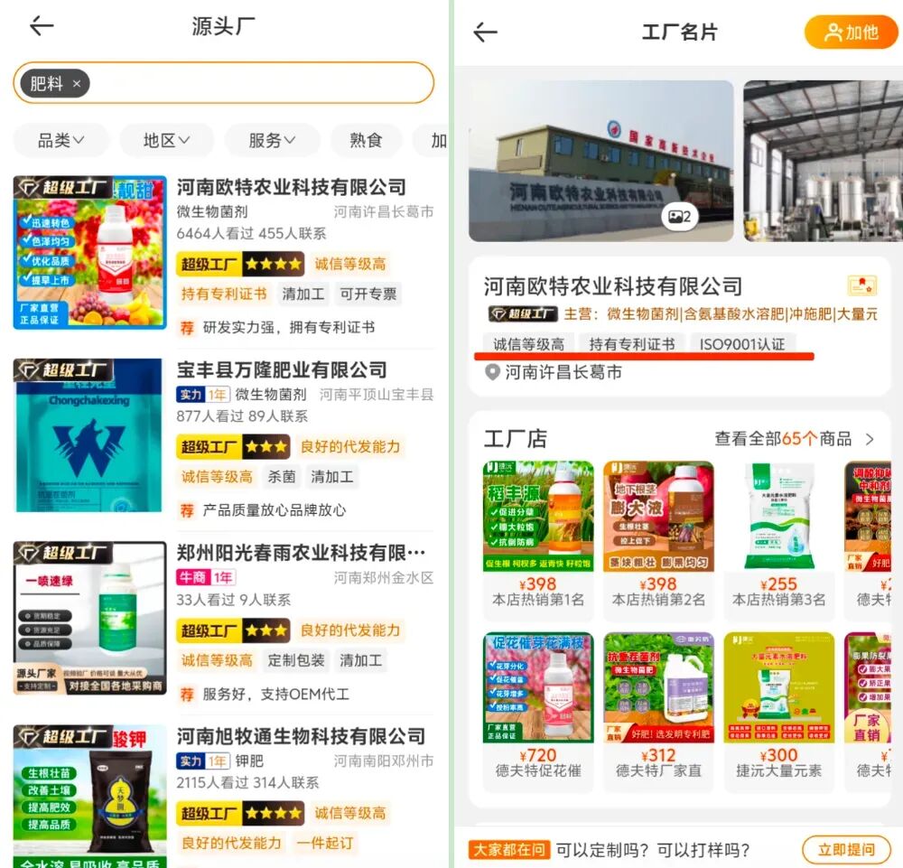 第一,要看资质。正规农资商家必须具备营业执照、生产经营许可证等资质,并在企业查询系统中登记,采购时优先选择正规渠道、大品牌。以一亩田平台“找工厂”专区的商家为例,正规商家会直接展示相关资质、工厂地址及照片等详细信息,品质靠谱有保障。