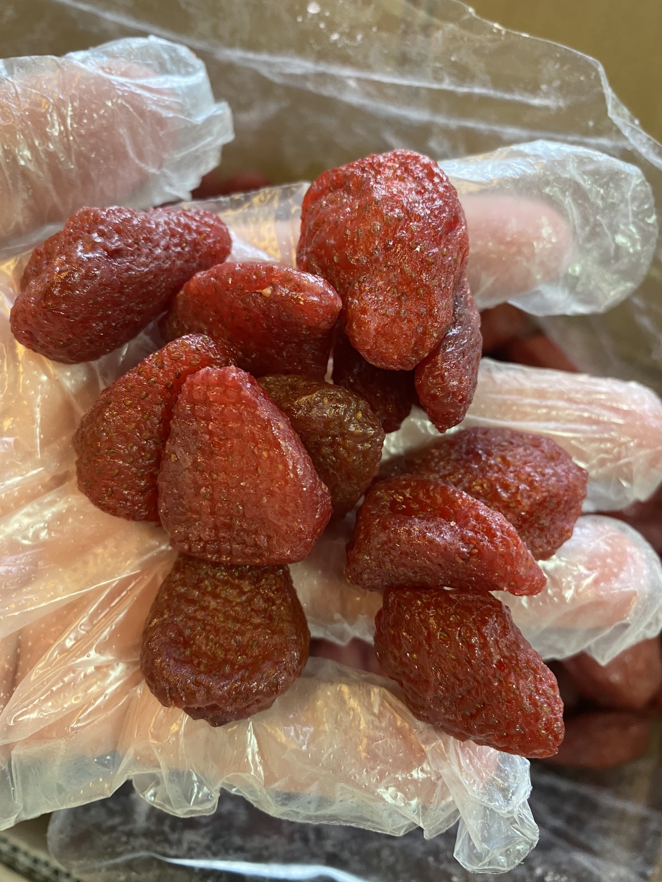 最后,经过脱水后的草莓脆会被迅速冷却并进行包装,防止受潮影响口感。为了保证品质,通常会加入食品级干燥剂,并采用密封铝箔袋包装,便于长期保存。
