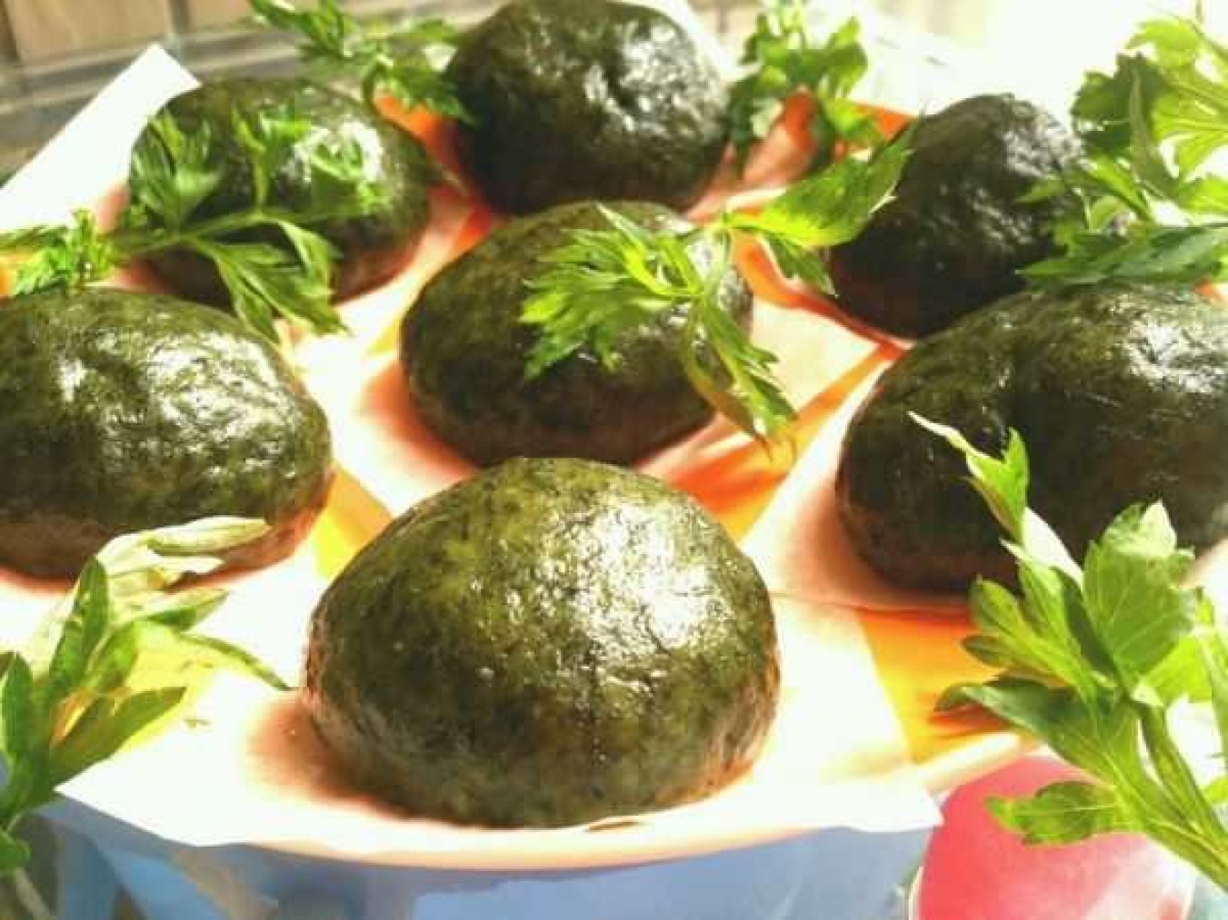 将面团搓成长条后切成小剂子,压扁后用擀面杖擀成圆形,放入芝麻馅后收口搓圆。蒸锅中铺上油纸或刷一层油防粘,水开后放入青团,中小火蒸10分钟即可。蒸好后趁热表面刷一层熟油,可以让青团更光亮柔滑,不易干裂。