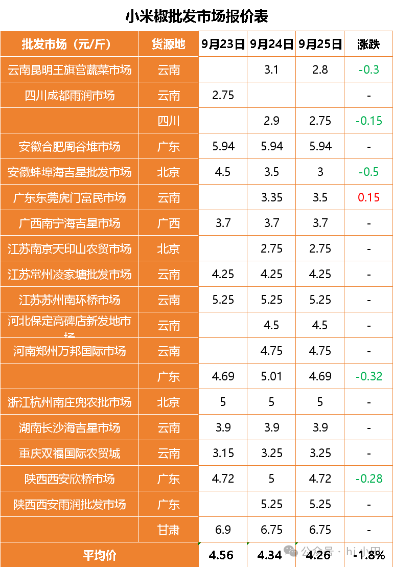 小米椒4.26元,跌1.8%。