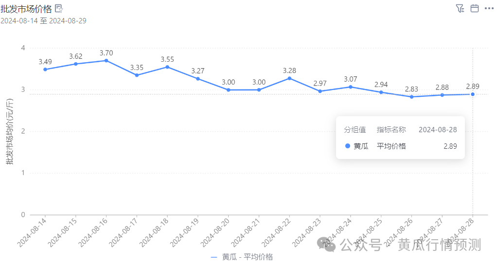截止到8月28日晚,全国批发市场黄瓜价格2.89元/斤。与前一日相比持平略涨1分。