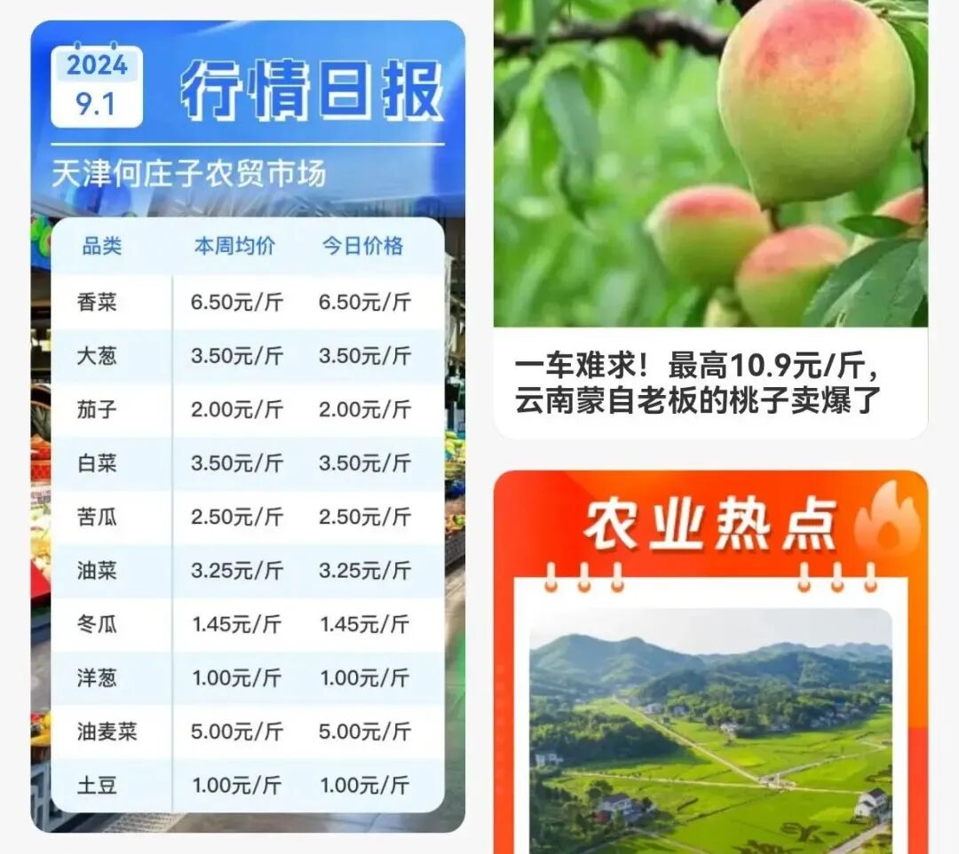 行情日报:这个模块主要更新不同品类、不同城市的批发市场的行情信息;同时还包括一些大型批发市场卖货实况,品类多、城市多,帮助更多用户全面了解市场行情,把握卖货节奏。