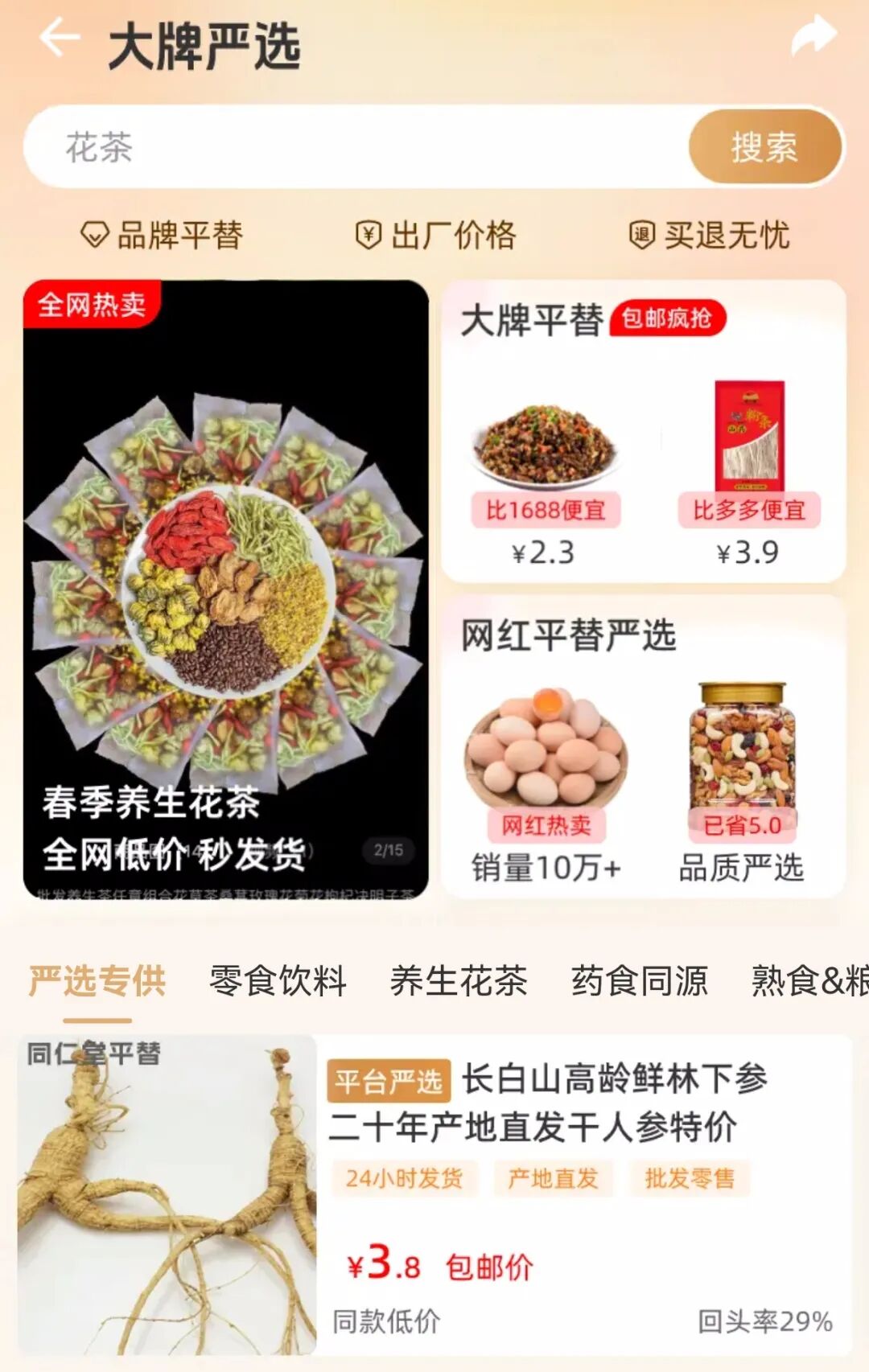 大牌滋补中药材店,20年林下参一棵要卖100+,这里只需28.8元;70克山珍菌汤包,品牌店要卖20+,这里只需5.5元;精品生鲜超市海苔虾饼30元一袋,这里仅需9.5元……