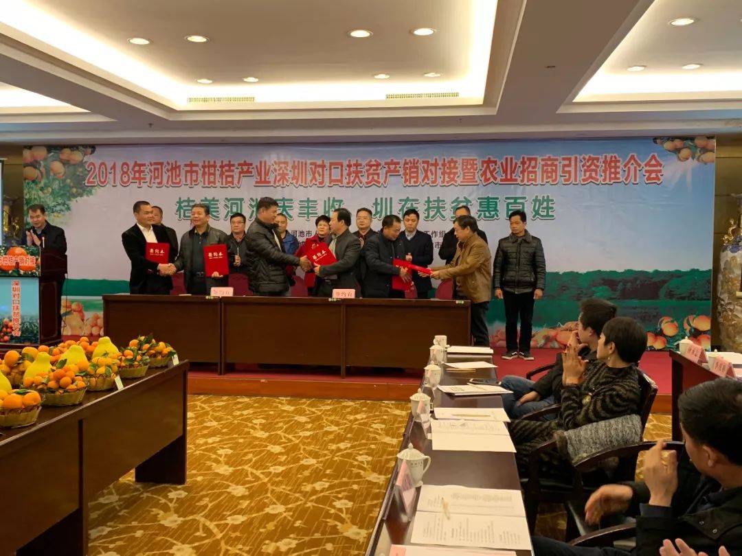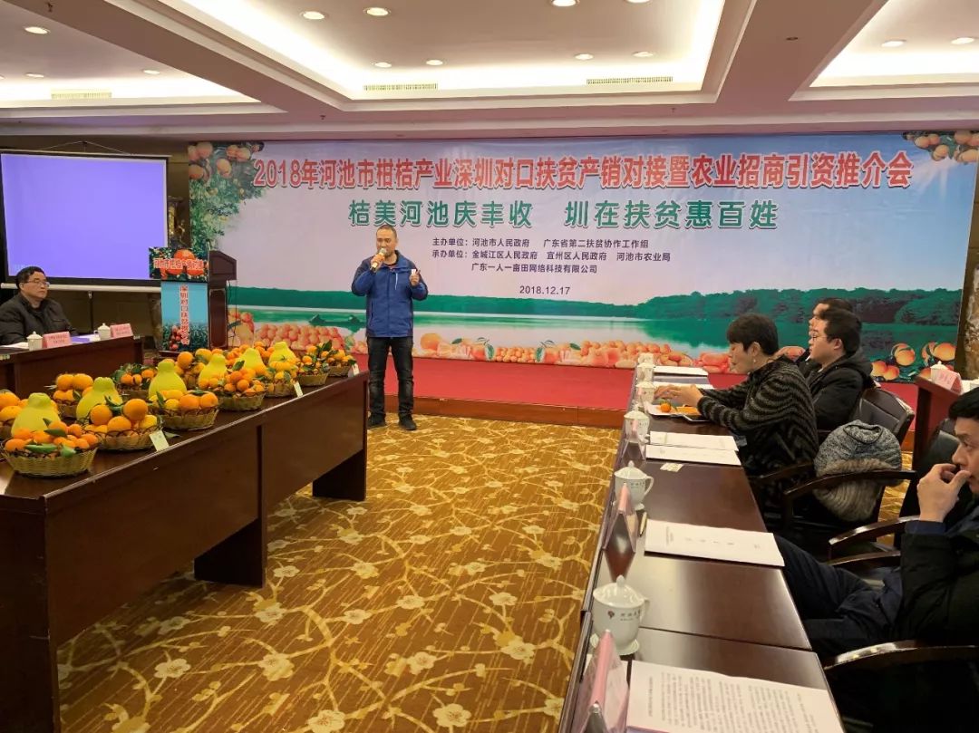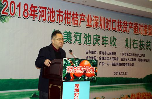 12月16-17日,由河池市人民政府、广东省第二扶贫协作工作组联合主办,广东一人一亩田公司等机构共同承办的2018年河池市柑桔产业深圳对口扶贫产销对接暨农业招商引资推介会在广西河池举行,旨在通过产销深度对接,助力区域实现精准脱贫。