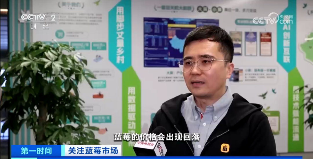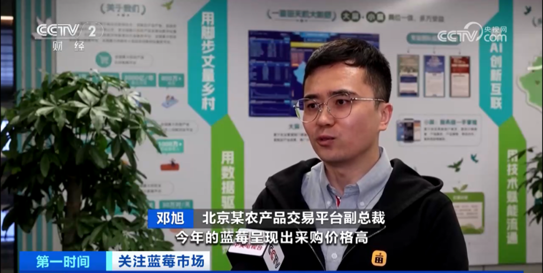 3月24日,中央电视台二套《第一时间》聚焦蓝莓产业,重点关注一亩田平台云南蓝莓用户产销情况,并采访平台副总裁邓旭,就未来产业趋势进行分析。