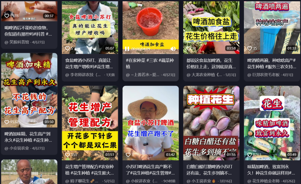 但仔细看,有一些基本的常识,比如刷多了你会发现很多所谓专家,口述的内容基本都是一样的。比如一个典型的话术,“味精加啤酒,致富到永久”“小苏打加啤酒,花生增产跑不了”、“啤酒加白醋,高产挡不住”,仿佛啤酒成了花生高产的“武林秘籍”。且不说能不能真的有用,一亩地光啤酒的成本就够买这些花生了吧。