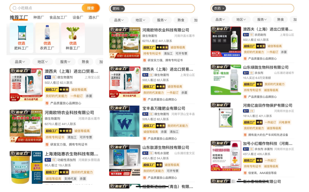 同时一亩田还在「找工厂」专区,为农药和肥料品类开设专栏,这里的商家都是经过官方严选的大厂家,源头直采价更优,品质靠谱有保障。