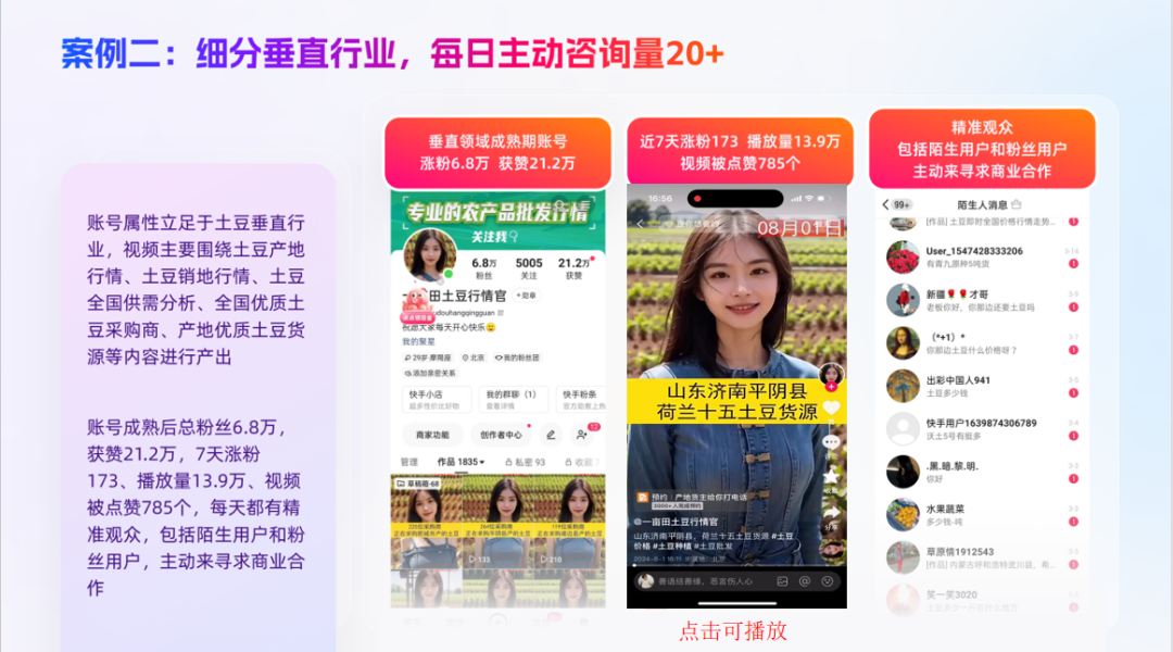 之后再通过精细化的运营,将公共领域的目标客户拉进微信群、粉丝群等私域空间,进一步通过持续性的短视频内容传播,筛选私域空间粉丝找到精准客户。一条自然播放量50万的视频,即使转化率仅有0.1%,那也将获得500个精准客户。如果要想通过其他渠道获取500个精准粉丝,成本势必成倍增长。
