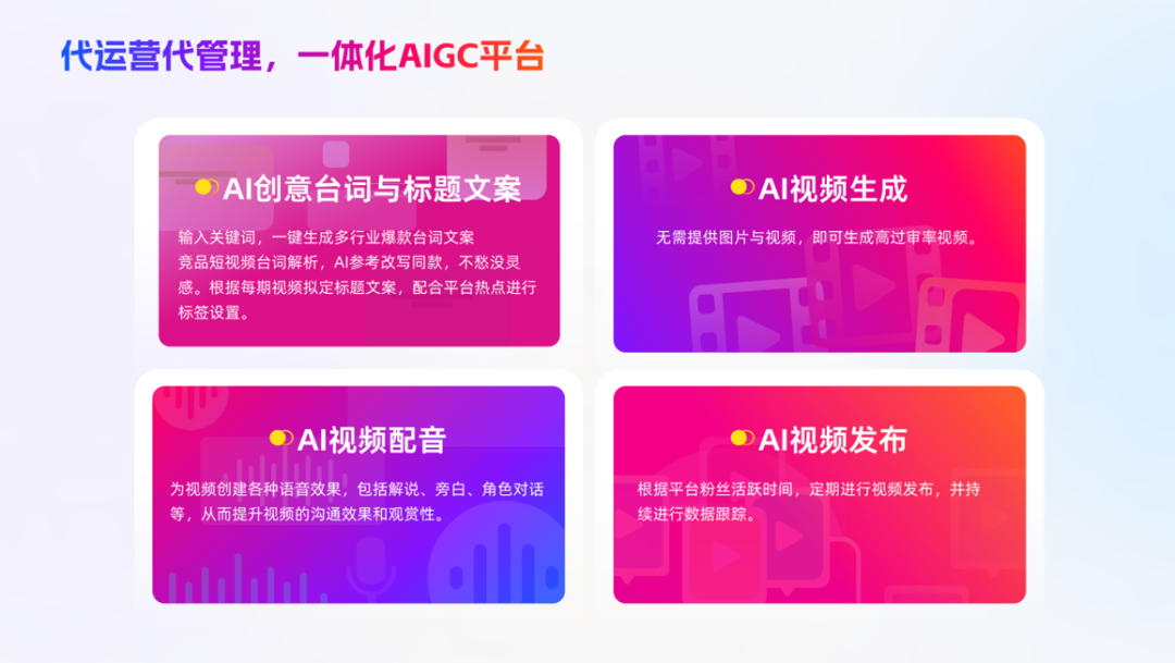 通过产品的AI大模型,可以自动生成创意标题、视频内容、多种效果配音,自动发布,商家不用安排额外人力成本去管理。很多农资商家受限于技术、人力成本等,不能发挥短视频作用,矩宝盆项目一体化解决方案,帮助你0基础用短视频扩大传播获客。