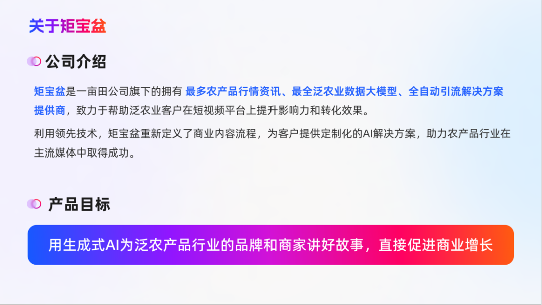 矩宝盆是一亩田旗下拥有最多农产品行情资讯、最全泛农业数据大模型、全自动引流解决方案提供商,可以根据AI生产出更加垂直、用户更关心的农业产品内容,以垂直内容为客户吸引更多自然流量和客户资源。