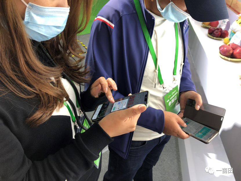 色泽鲜亮,气味香甜的苹果在现场吸引了络绎不绝的观众和客商聚集到一亩田展台周围,他们可没有只是咽下口水,扫描苹果背后的二维码,不少观众就在一亩田的各家苹果店铺直接下单,有的采购商和供应商在线沟通,直接整车发货。