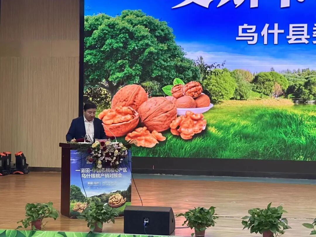 乌什县委副书记、县长艾斯卡尔·托乎提上台进行了致辞与推介,他表示:“目前全县核桃面积已达32.3万亩,产量可达8万吨以上,核桃产业已由规模化向标准化、规范化、优质化方向迈进。希望借助此次乌什核桃产销对接活动,搭建起一亩田-乌什核桃线上品牌馆、乌什核桃采购商联盟等线上店铺,多措并举打开乌什核桃销路,集中展示农产品品牌建设成果,完善乌什农产品供应链。”