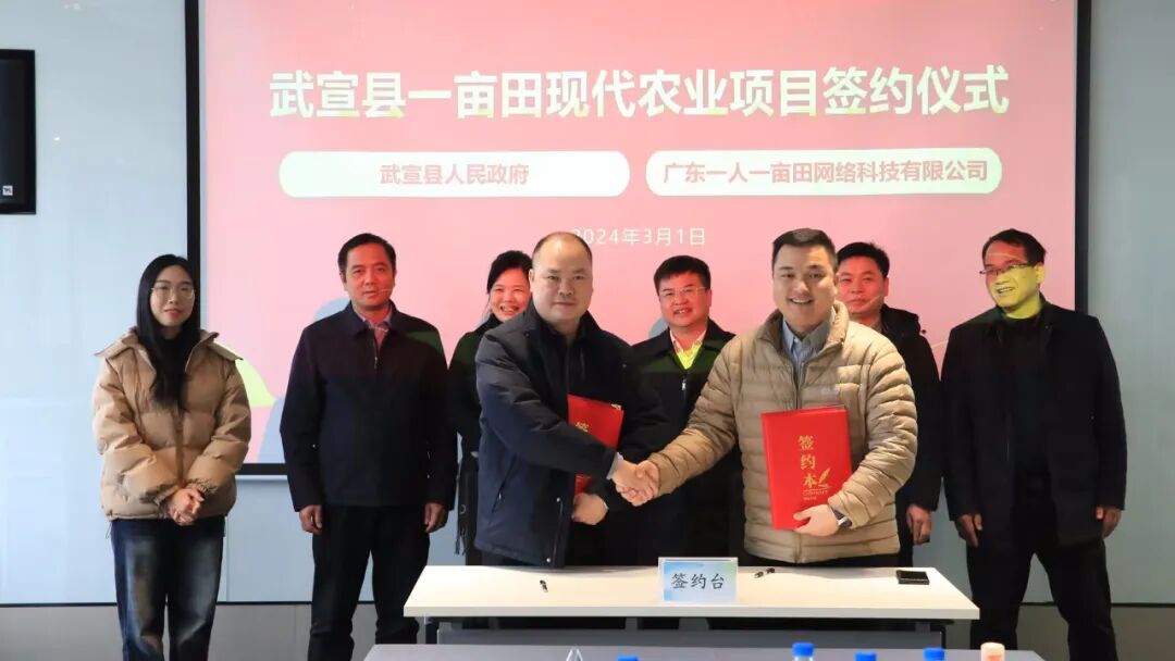 3月1日,广西来宾市武宣县人民政府与一亩田正式签订框架合作协议,将在武宣县全面落地一亩田“沃众田”数字农业生产模式,以“新品种 新技术 新渠道”服务13000亩土地的现代农业生产体系建设。根据协议,种植品类将以新品种辣椒为主,同时发展连片秋冬菜种植及预制菜精深加工,以数字渠道拓展武宣县农产品销售渠道,助力乡村振兴。武宣县县委书记雷应天率队,与一亩田华南区总经理易莉莉,广东一亩田公司副总经理范国信共同完成签约。
