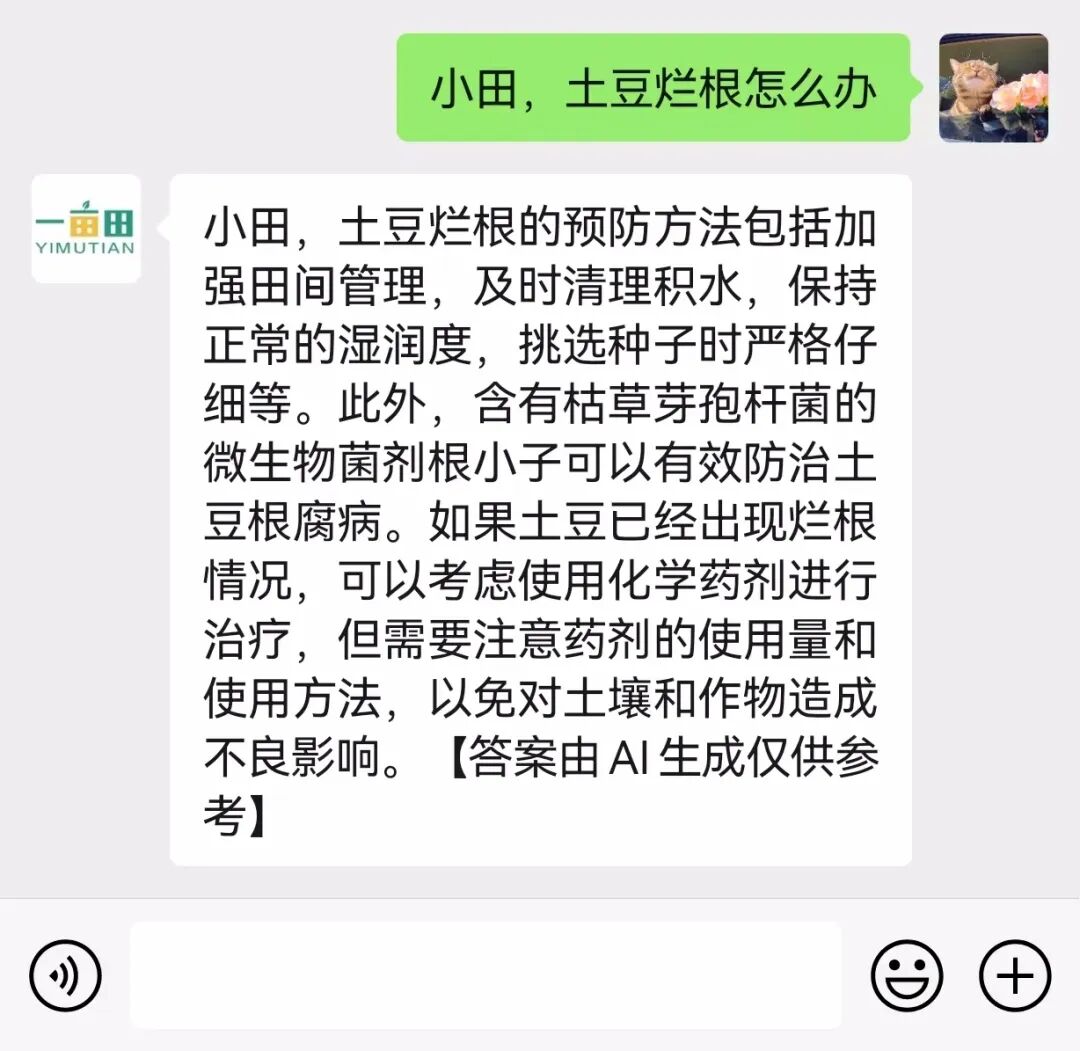 在产中,我们遇到的农技难的问题,小田也提供了这样的一个对话解决方案。比如说“土豆出现烂根怎么办?”小田根据它的知识库给到“土豆出现烂根大部分是根腐败,需要注意增施有机肥料,需要在种植时候防止雨水过多,田间积水”,这个回答我们通过横向对比,还是相对比较专业的。