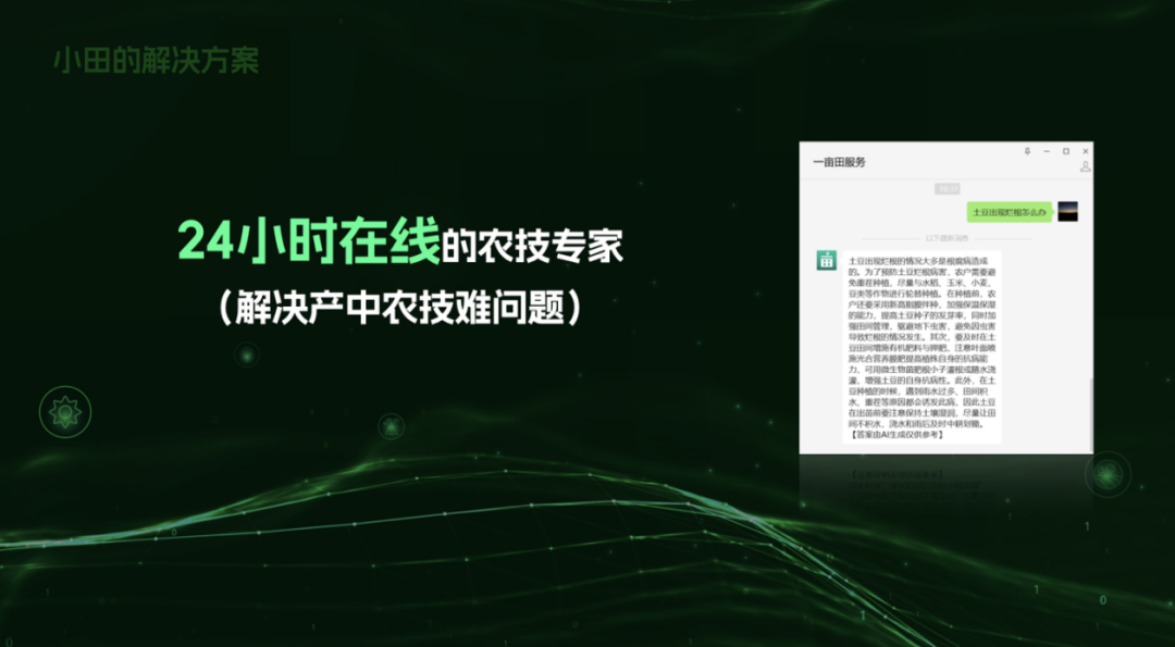 除了在多模态升级之外,下一步小田也将提供一个生态合作的框架。我们深刻地知道,要服务中国这么多的农户,这不是我们一家公司能做到的事情,我们需要全国的农业从业者和我们一起,包括农业科研院所、活跃在不同县市的田间地头的农技专家们,还有农资农机、种苗厂商们,他们其实都是小田的生态合作伙伴,现在我们已经有了部分的科研院所和农技专家的合作,同时我们也在面向全国所有的农资农机、种苗厂商进行这样一个知识合作的招募。