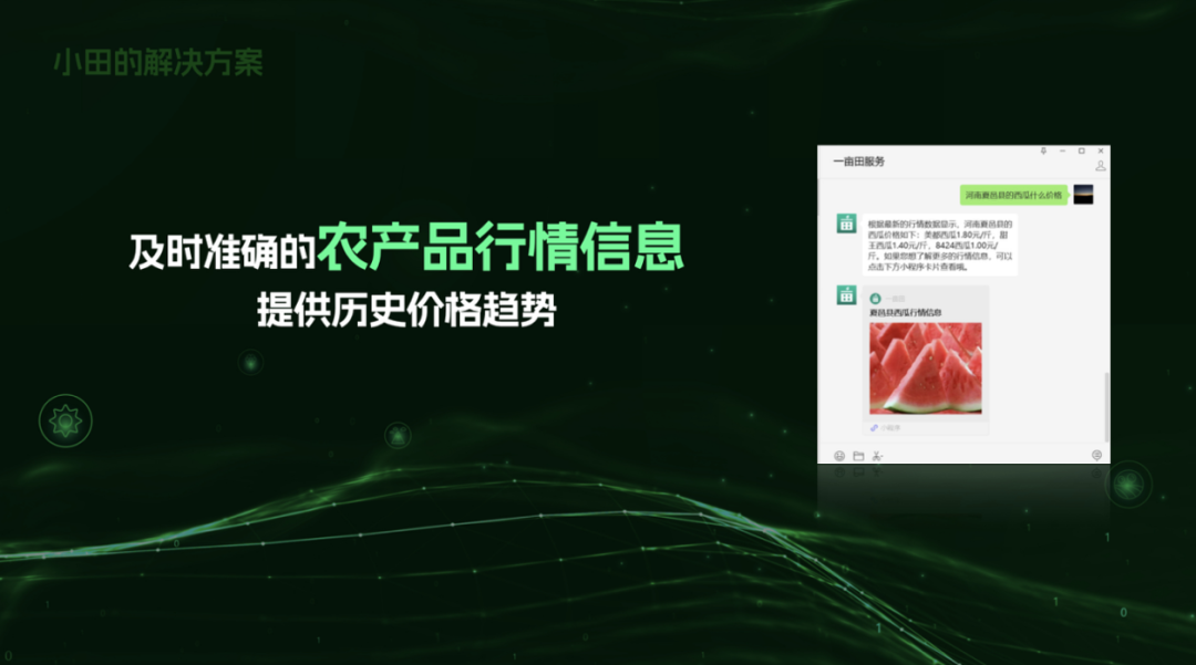 产后,我们在销售环节里面有一个很大的痛点,就是不知道现在的行情怎么样,我不知道我现在是不是应该快速地去卖,还是等待着一个更好的行情,小田结合过去一年农产品全国的流通大数据,能够帮助用户去给到河南夏邑县的西瓜现在是什么行情。根据不同的地域、不同的品类,我们可以及时地告诉用户当前的行情的状态,同时也会给到一个小程序的卡片,进一步地获取更详细的信息。