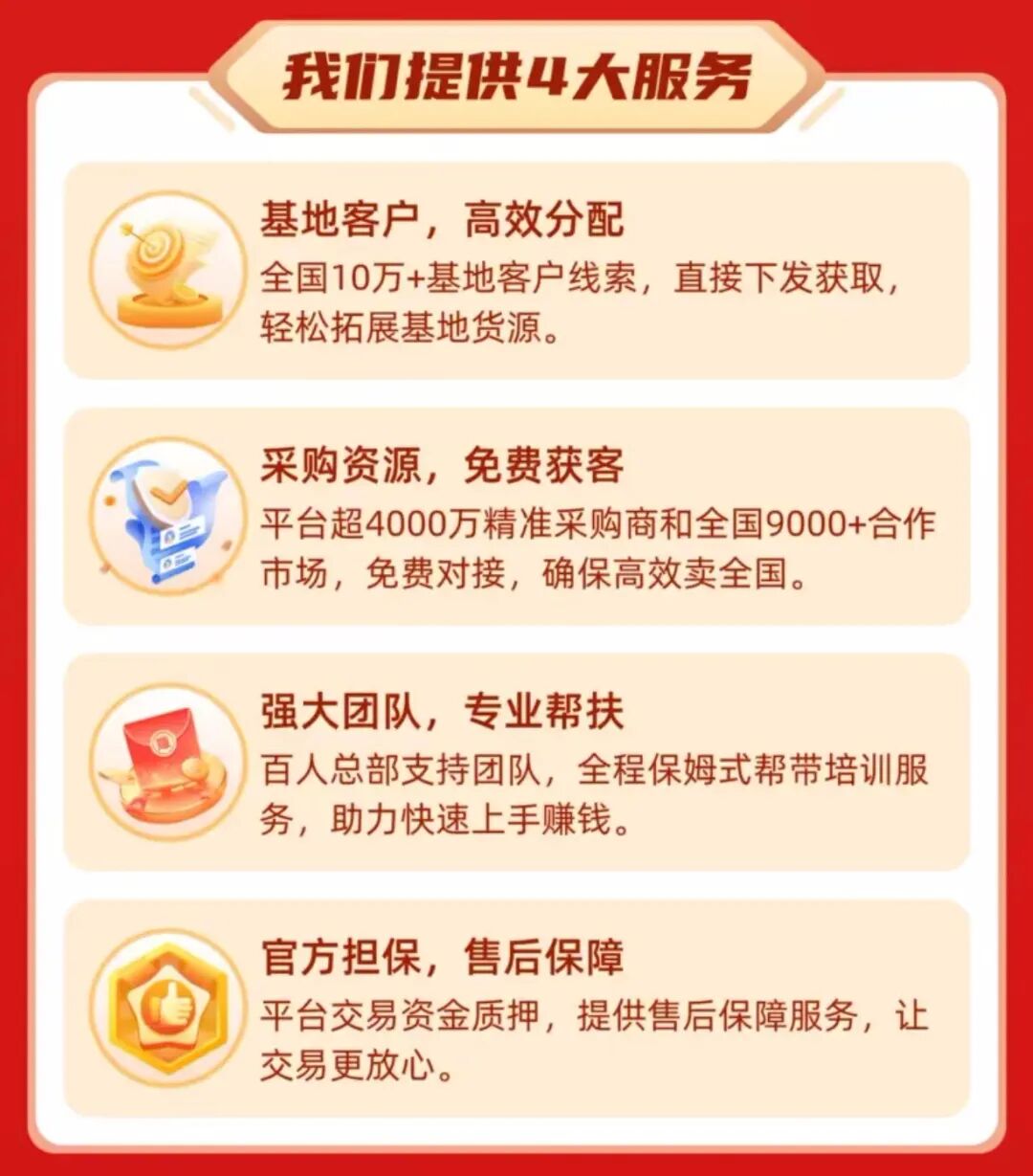 这次,你可以不用担心。项目通过基地客户分配、采购资源对接、百人团队帮扶、平台交易保障四大措施,助你创业无忧。